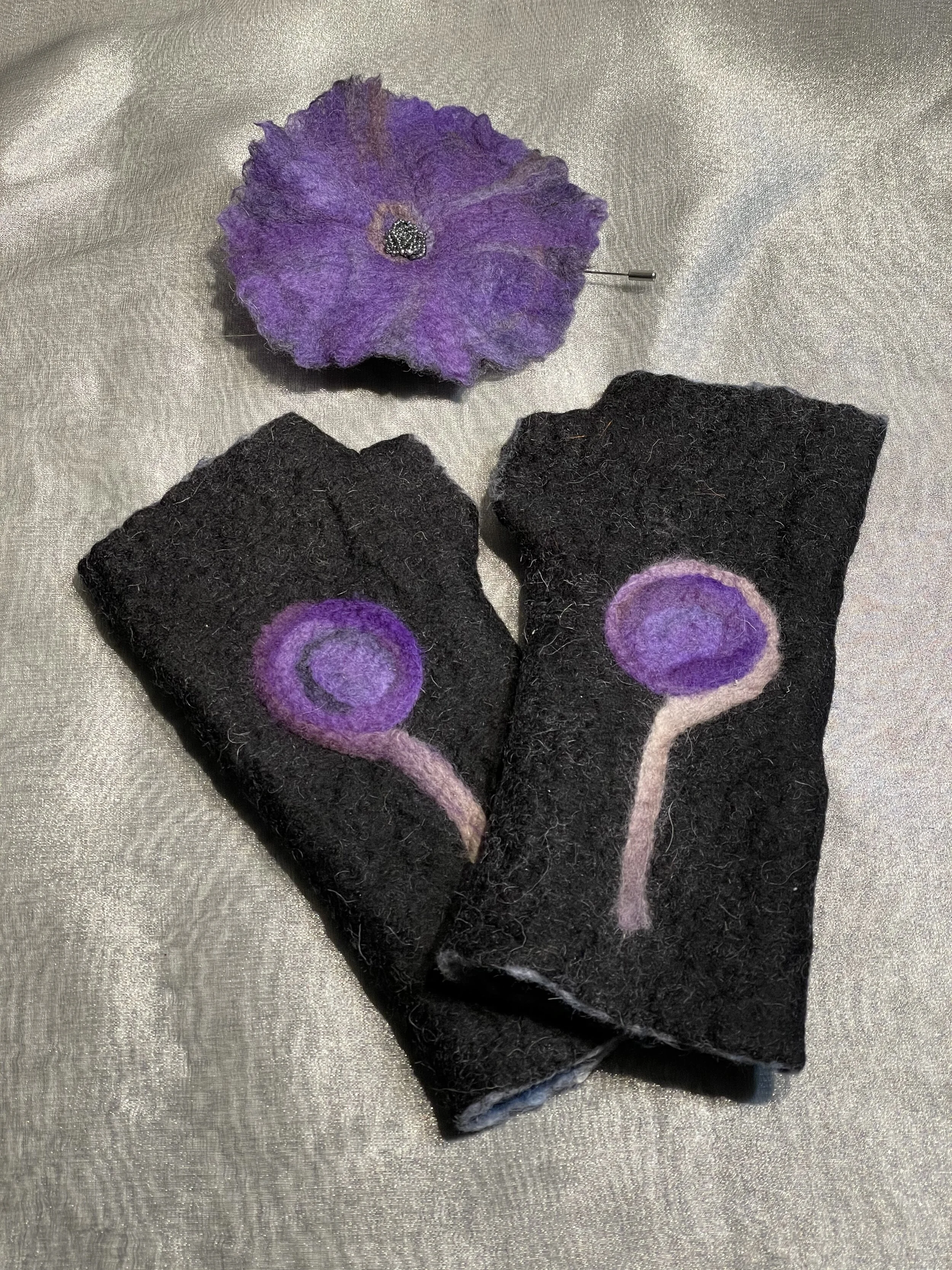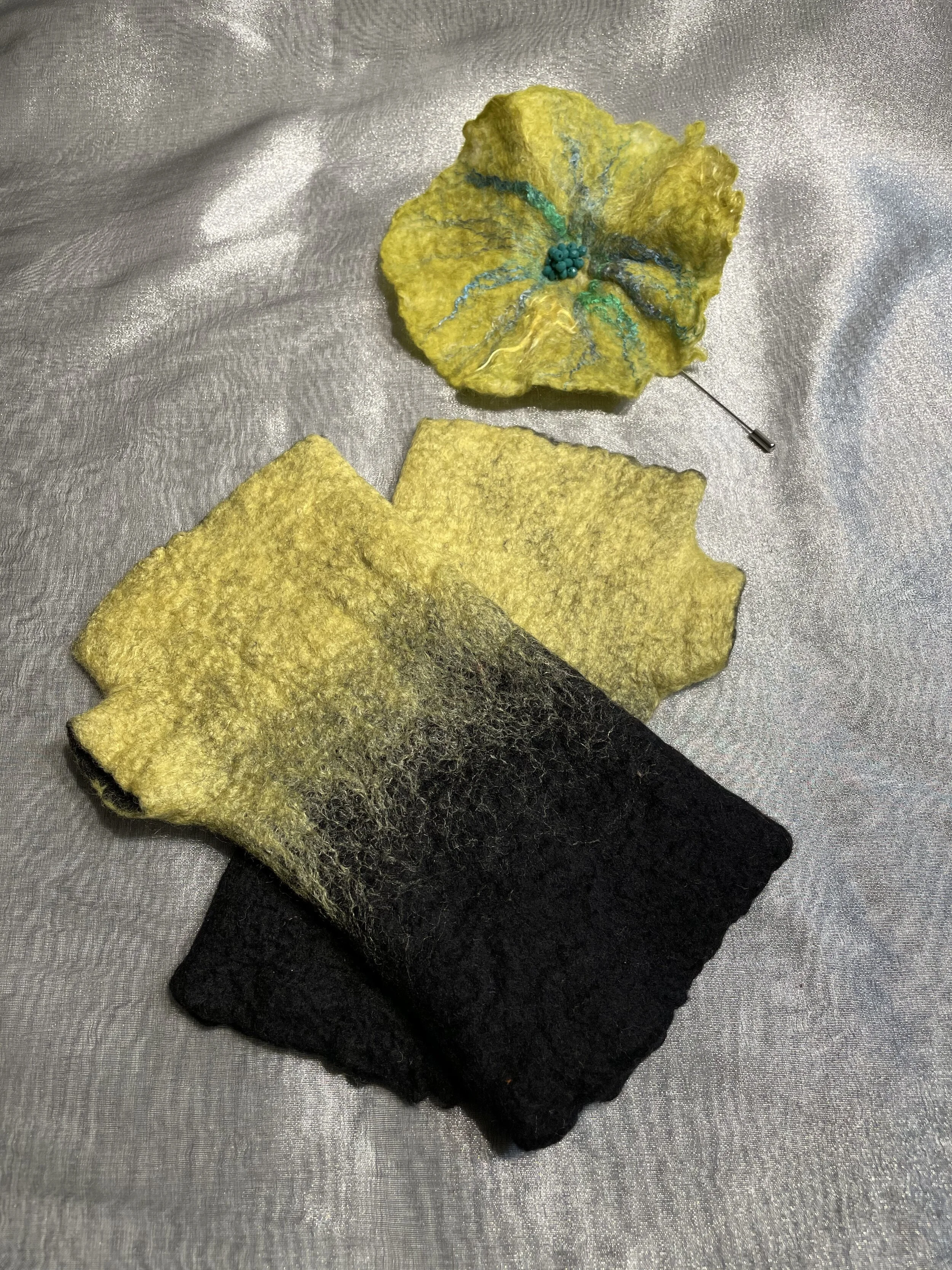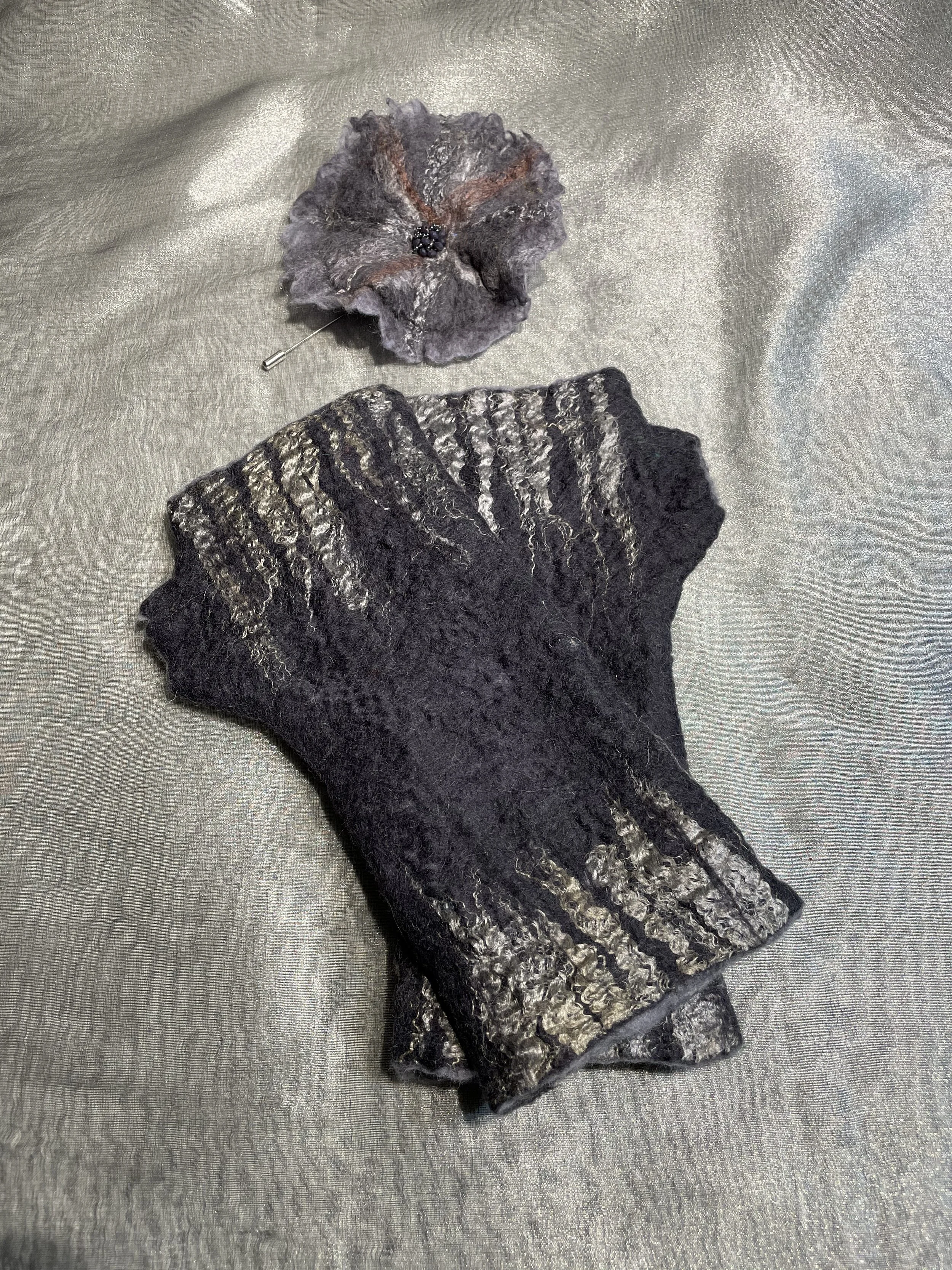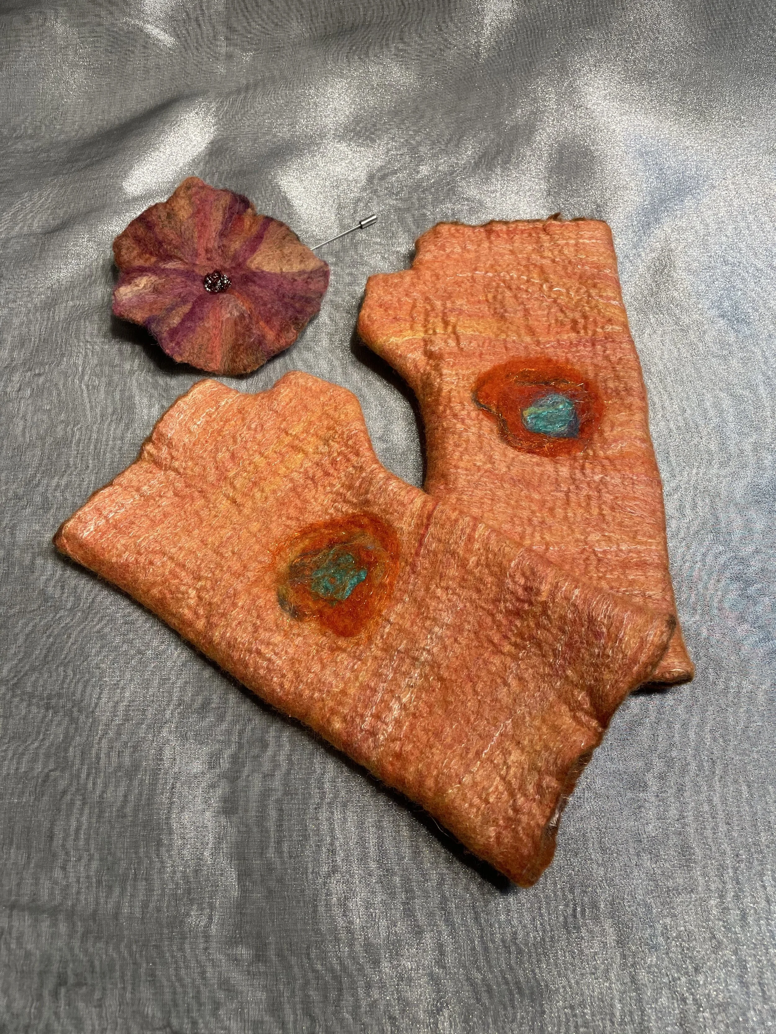 Nuno felting is a fabric felting technique developed by Polly Stirling, a fiber artist from New South Wales, Australia, around 1992. The name is derived from the Japanese word "nuno" meaning cloth. The technique bonds loose fibre, usually wool, into a sheer fabric such as silk gauze, creating a lightweight felt. The fibres can completely cover the background fabric, or they may be used as a decorative design that allows the backing fabric to show. Nuno felting often incorporates several layers of loose fibres combined to build up colour, texture, and/or design elements in the finished fabric.The nuno felting process is particularly suitable for creating lightweight fabrics used to make clothing. The use of silk or other stable fabric in the felt creates fabric that will not stretch out of shape. Fabrics such as nylon, muslin, or other open weaves can be used as the felting background, resulting in a wide range of textural effects and colours.Nuno felt is an extremely versatile created fabric. It can be made in many weights to accommodate many different uses. It can be made much lighter in weight than traditional all-wool felt accounting for its wonderful movement and drape. Because of the range of weights possible with the cloth very fashionable and exciting garments can be made.